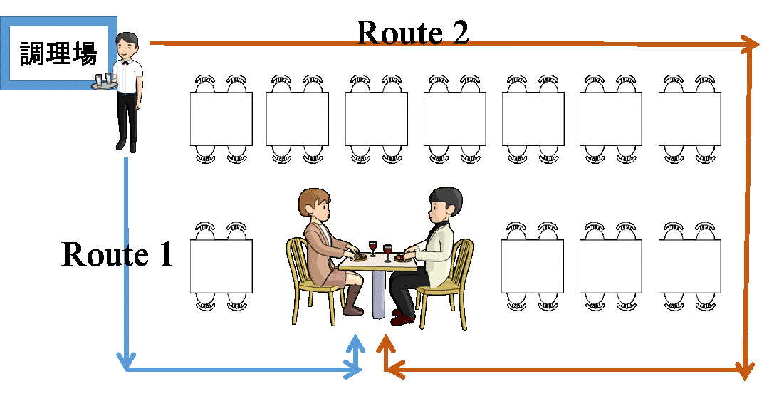 ルート1、ルート2、どちらのコースを通り、お客さまのテーブルまで運ぶことが、正しいでしょうか。